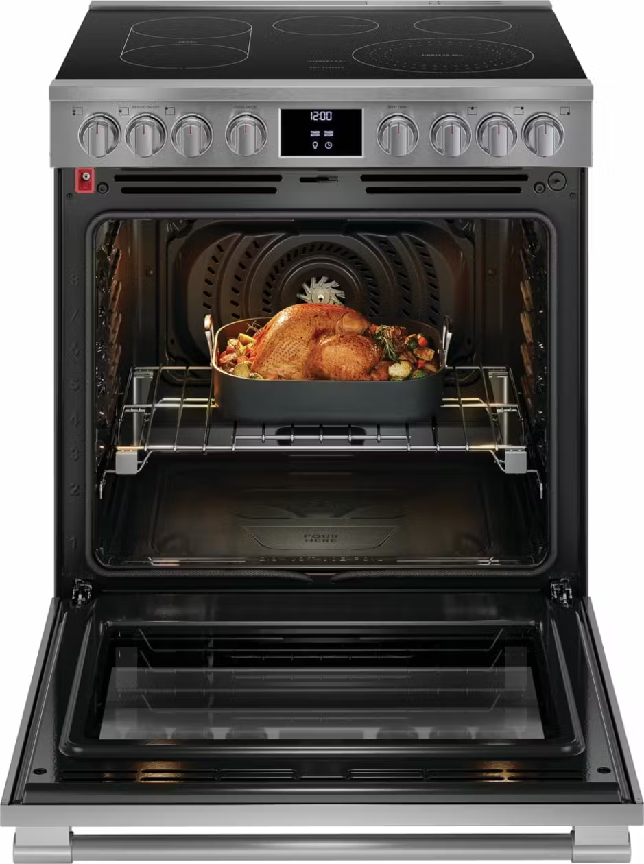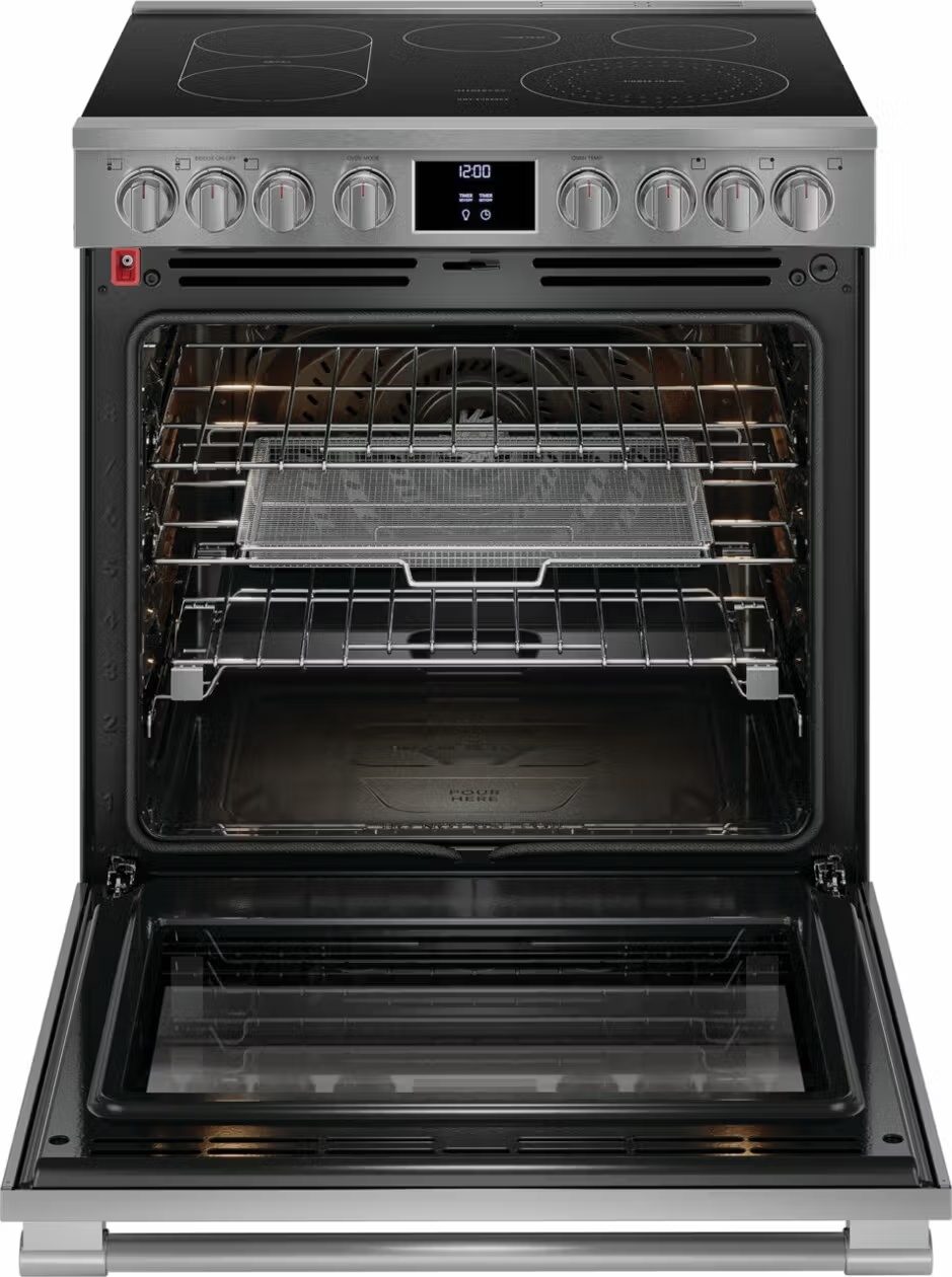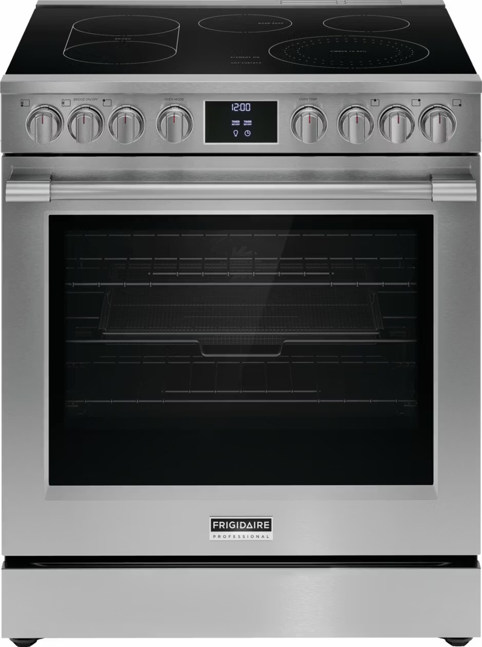 Meet the Frigidaire Professional PCFE3080AF, a premium slide-in electric range built for serious cooks. With Total Convection and No Preheat capability, it eliminates the waiting game—just place your food inside and start cooking. This range also offers Air Fry functionality built in, so you can enjoy healthier, crispier results without a separate appliance. The cooktop features five elements, including a high-power 3,200 W EvenTemp® element and a bridge function for oversized cookware. Backlit LED knobs provide visibility and style, and the Smudge-Proof® stainless steel finish keeps things sleek and clean.